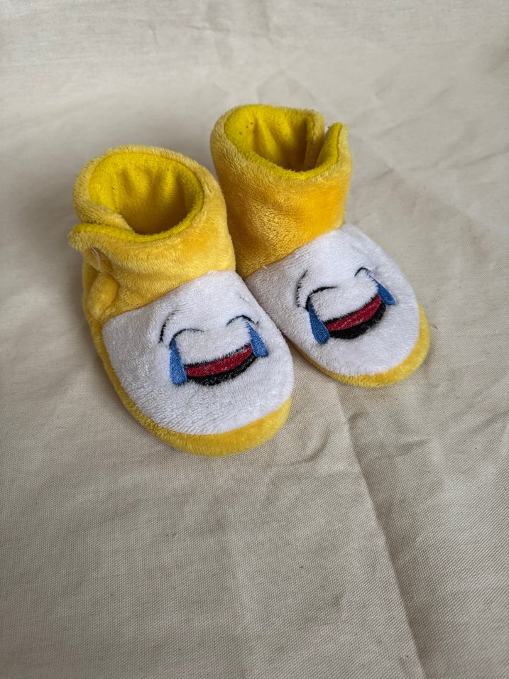 Yumuşak kumaşlı sarı kız çocuk terliği, nakışlı pop kültür emoji desenleri ve örme detaylarla rahat ve renkli.