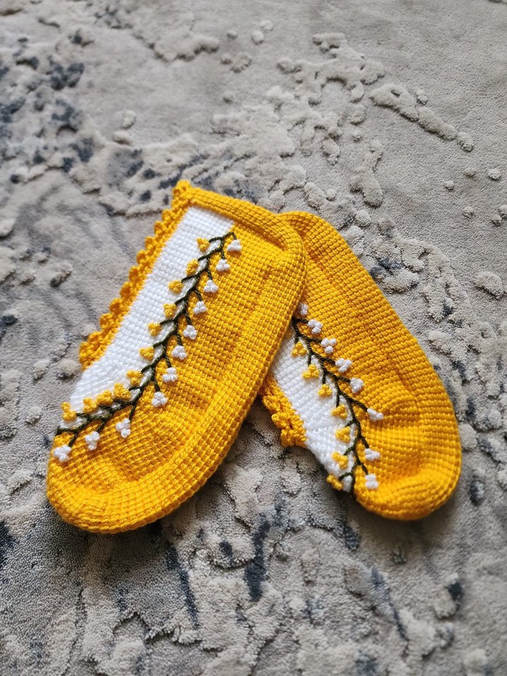 Renkli, sarı ve beyaz nakışlı çiçek detaylı örgü kadın terlikler, günlük kullanım için rahat ve bohem tarz sunar.