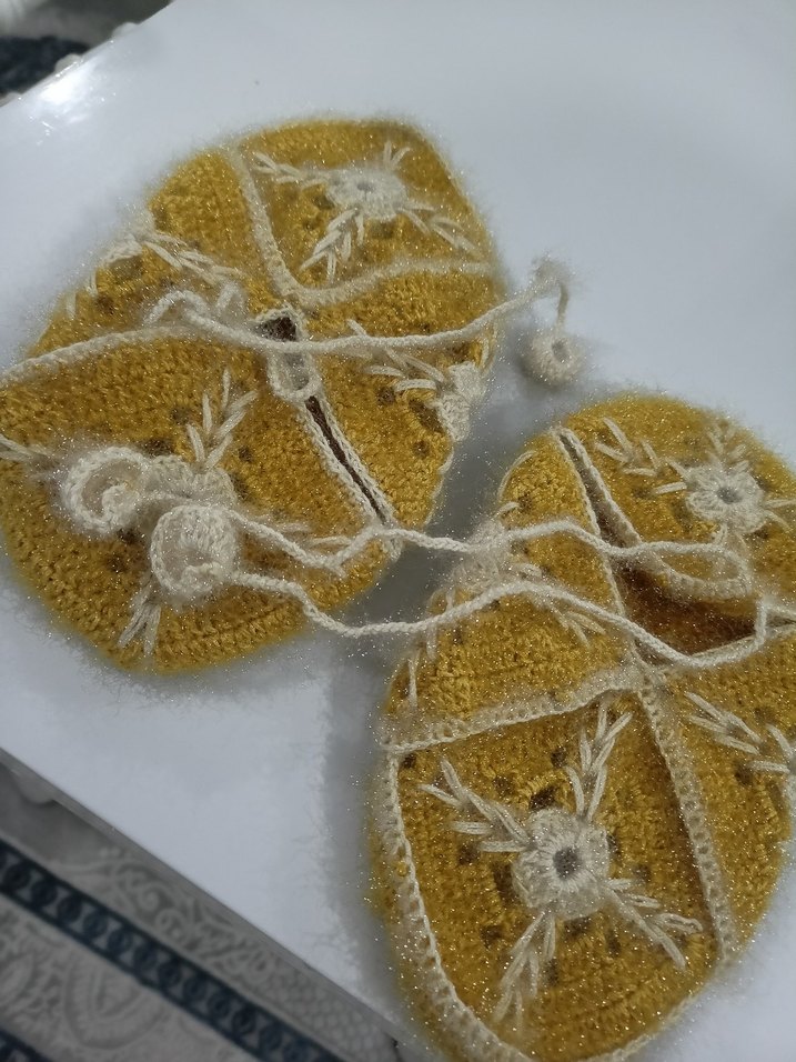 Nakışlı çiçek desenli, bağcıklı açık sarı çetik. Çeyiz için uygun. Sıfır simli gibi parıltılı ipi