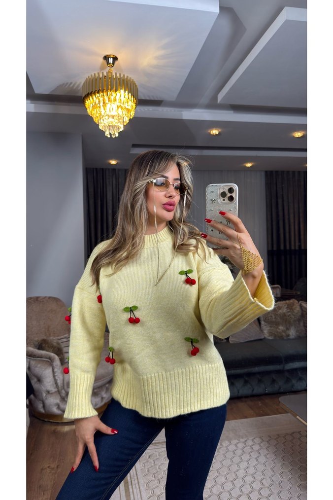 Bu açık sarı renkli, nakışlı kiraz detaylı, uzun kollu ve bol kesim triko kadın kazak, günlük rahat kullanıma uygundur.