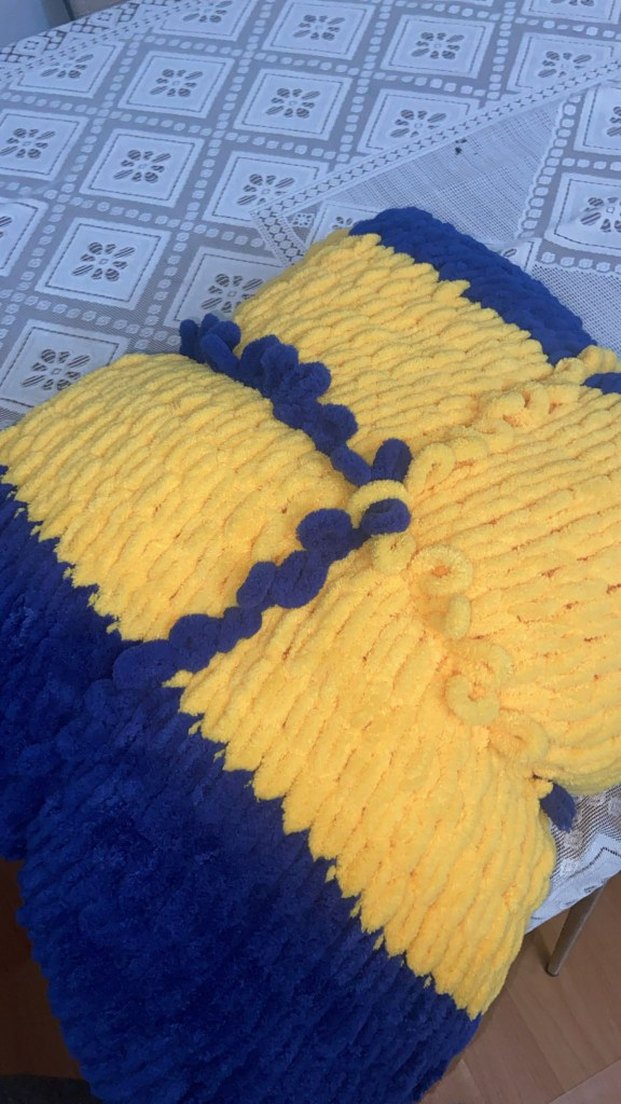 Siparişle yapilir, örnektir. Nakışlı detaylara sahip sarı ve mavi renklerde dokulu, renkli battaniye. ️