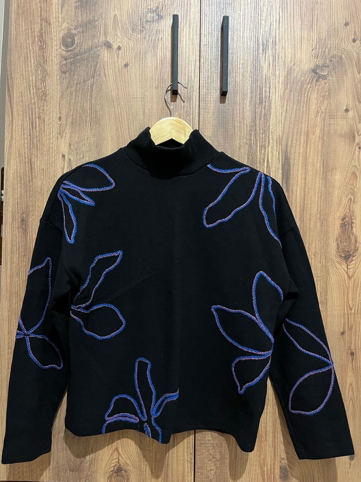 Siyah boğazlı, uzun kollu ve nakış detaylı triko kazak. Rahat kesimi ve yumuşak dokusuyla günlük sokak stiline uygundur.