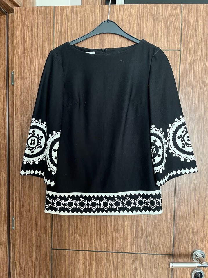Siyah, uzun kollu, yuvarlak yakalı bluz, kolları ve eteği beyaz nakışlı. Gevşek kesim, düğmeli ve midi boyda, ofis için uygun.