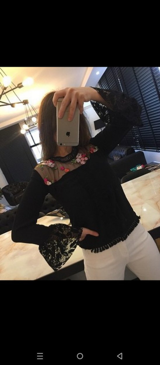 Siyah renkli, uzun kollu, nakışlı ve dantel detaylı bohem tarzda kadın bluz.
