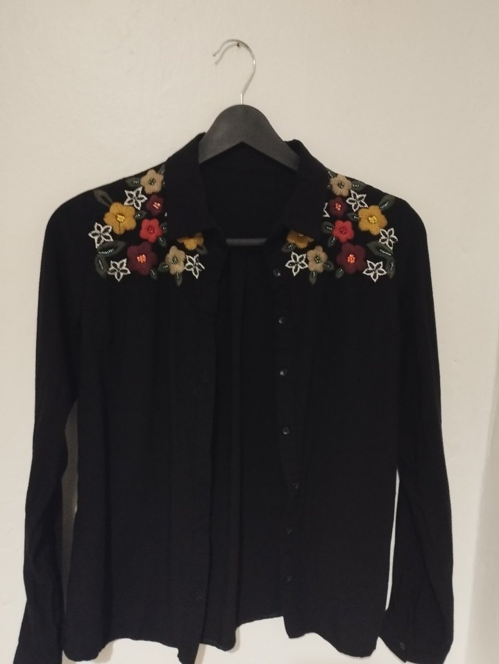 Siyah uzun kollu, yakalı ve düğmeli kadın gömlek. Omuzlarında renkli çiçek nakışı bulunur ve bol, rahat kesimlidir. Yumuşak tekstil kumaştan yapılmıştır, günlük kullanıma uygundur.