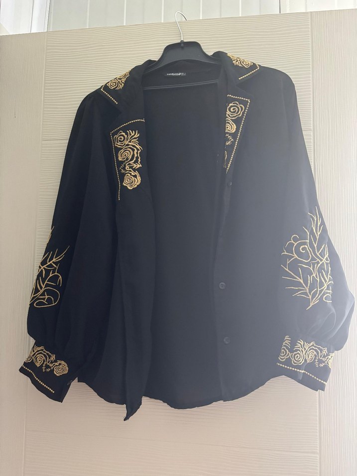 Uzun kollu, yakalı ve düğmeli siyah gömlek. Altın renkli nakış detayları ve ince, ipeksi kumaştan bohem tarzda uzun kesim gömlek.