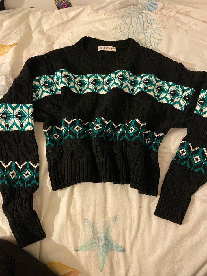 Nakışlı desenlere sahip, uzun kollu, siyah bohem tarzda kadın kazak. midi uzunluğu ile günlük kullanıma uygundur.
