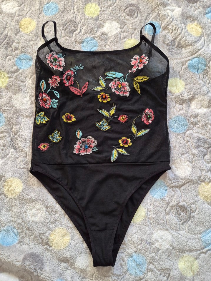 Nakışlı çiçek desenleri ve dantel detaylara sahip, ince askılı siyah bohem tarzı kadın mayo. Plaj için ideal.