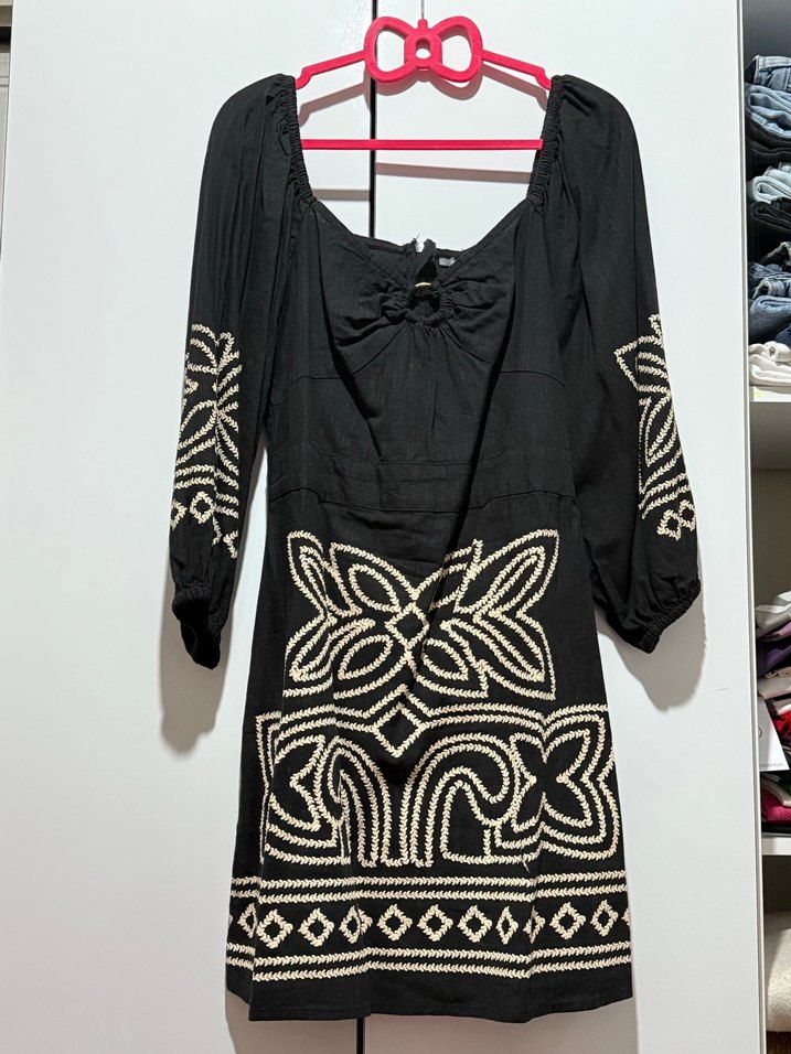 Nakışlı desenlere sahip siyah bohem midi elbise, bol kesim ve kemerli bel detayına sahiptir. Kayık yaka ve askılı kolludur, romantik akşamlar için uygundur. Defacto marka