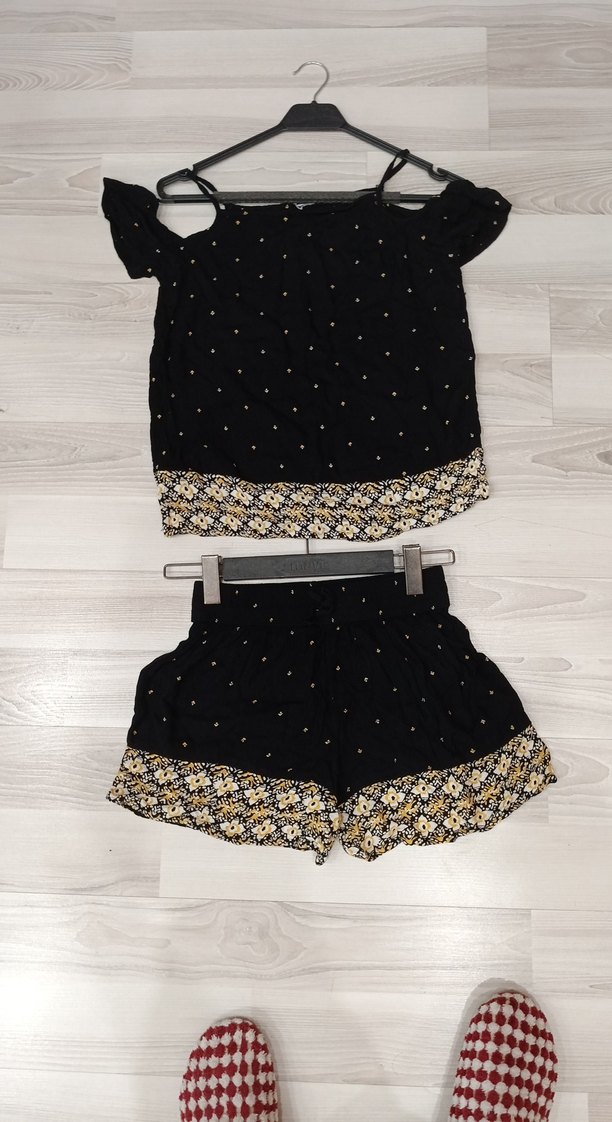 11-12 yaş kız çocuğu Nakışlı desenlere sahip siyah bohem mini şort bluz takım, askılı kollu, bol kesim. Çiçek desenli hareketli kenarları günlük kullanım için uygundur. #marka temsilidir