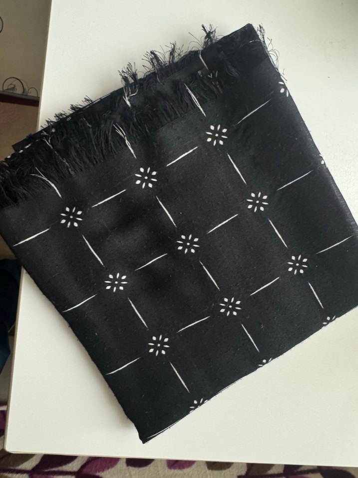 Nakışlı desenlere sahip siyah şal, bohem tarzda ve püsküllü kenarlarla. Minimalist ve retro görünüm sunar, midi uzunlukta.