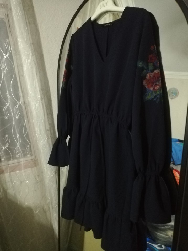 L beden M uygun Nakışlı çiçek desenli, V yakalı, bol kesim siyah midi elbise. Uzun kollu ve fırfırlı detaylara sahip bohem tarz.