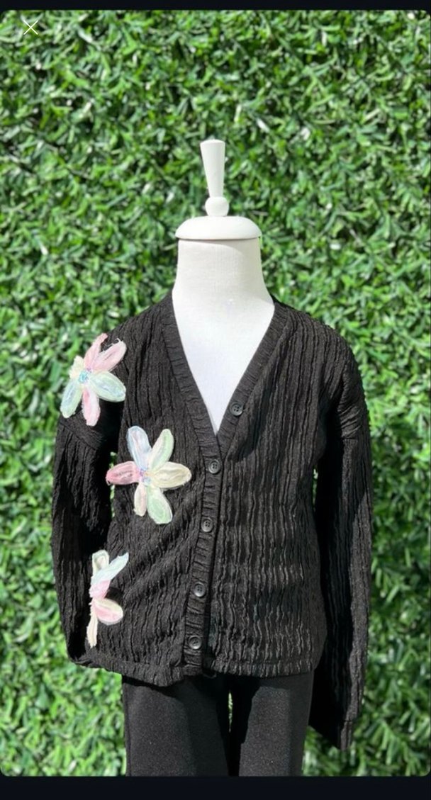 Siyah, uzun kollu, nakışlı çiçek desenleriyle bohem tarzda, V yakalı, rahat kesim örme hırka. Günlük kullanıma uygundur.