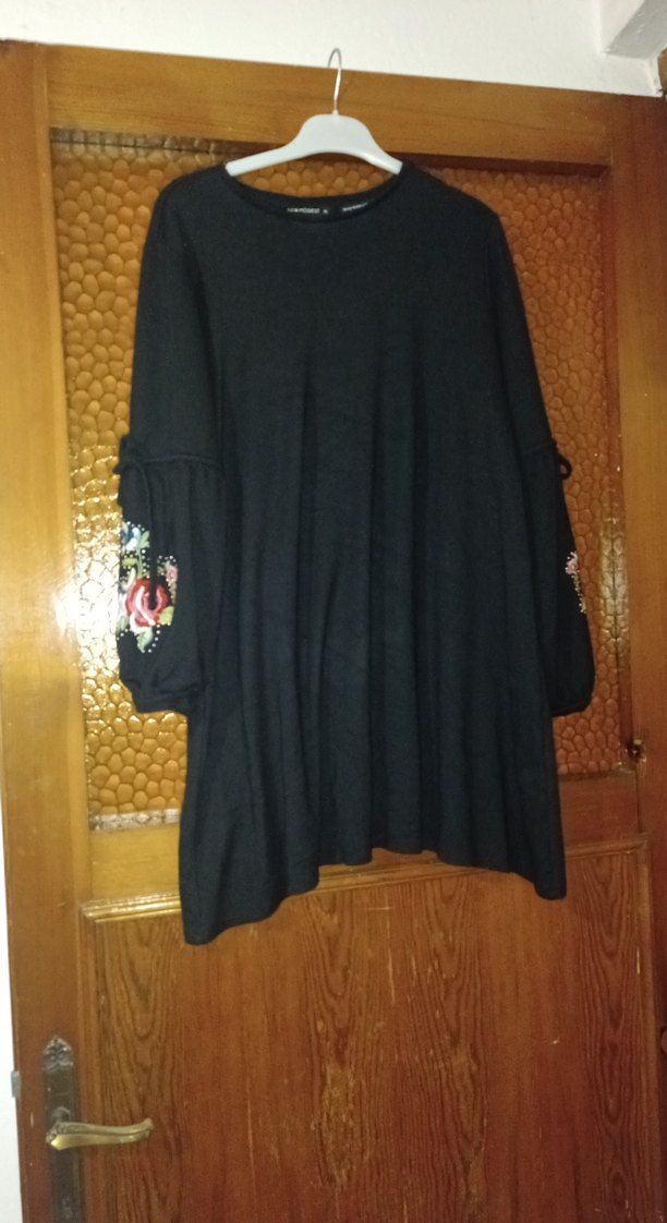 Nakışlı detaylara sahip siyah, uzun kollu, bol ve dökümlü bohem tarzda sentetik kumaş tunik. Günlük kullanıma uygundur. birkaç kere giyildi sadece