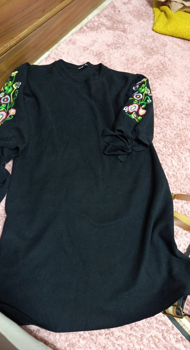 Siyah tunik, uzun kollu ve renkli nakış detaylarına sahip. Salaş ve drapeli kesimi, yuvarlak yakasıyla bohem tarzda, yumuşak sentetik kumaştan üretilmiştir.