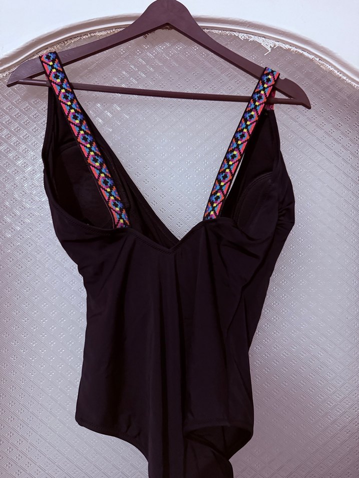 Siyah, bohem tarzda, nakışlı renkli askıları ve drapeli tasarımıyla uzun ve vücuda oturan mayo. ️