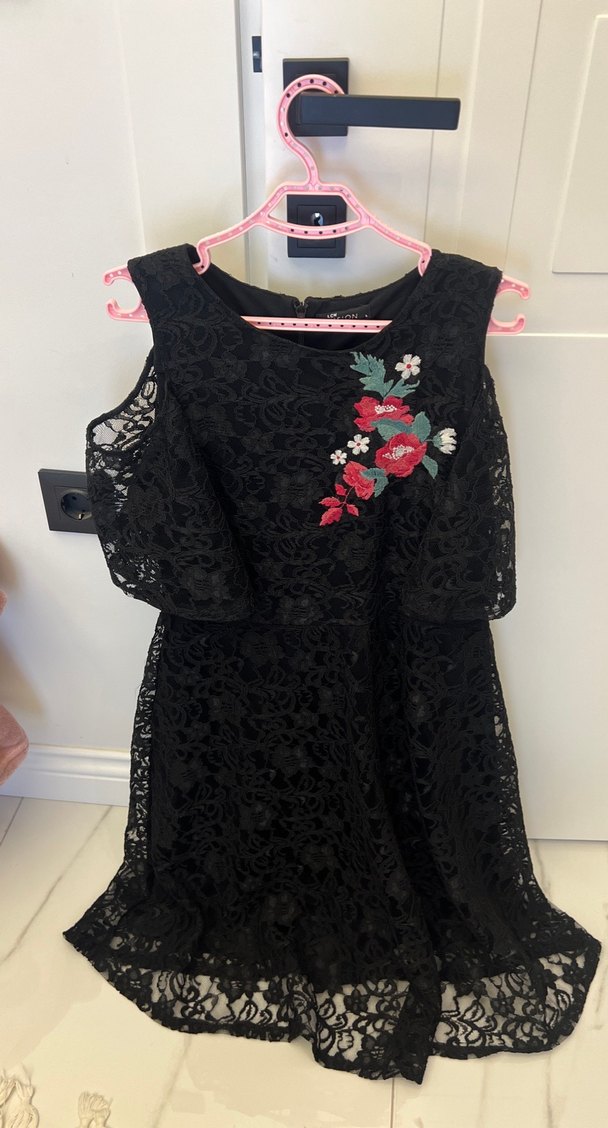 Fitted kesim siyah midi elbise, ince dantel ve nakışlı çiçek detaylarına sahiptir. Askısız, kolsuz tasarımı romantik akşamlar için uygundur. Diz altı