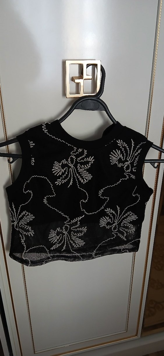 Nakışlı desenler ve dantel detaylı, siyah, kısa kollu, vücuda oturan mini bluz. Vintage ve gotik tarzda, açık hava kullanımı için uygundur.