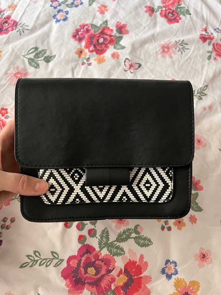 Siyah deri çanta, nakışlı desenleri ve kemerli detaylarıyla bohem tarzını yansıtıyor, günlük kullanım için uygundur.
