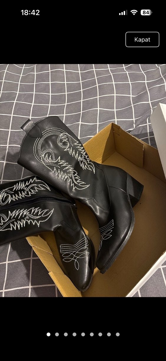 Siyah deri dizüstü botlar, blok topuklu, nakışlı detaylara ve tokalı aksanlara sahiptir. Bohem ve gotik tarzları birleştirir, trend günlük stil için uygundur.
