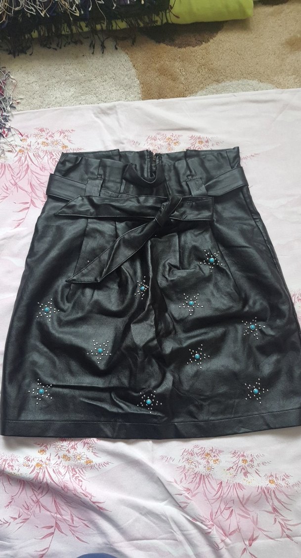 Nakışlı detaylara ve kemerli bele sahip, siyah deri mini etek. Gotik tarzda romantik akşamlar için uygun.