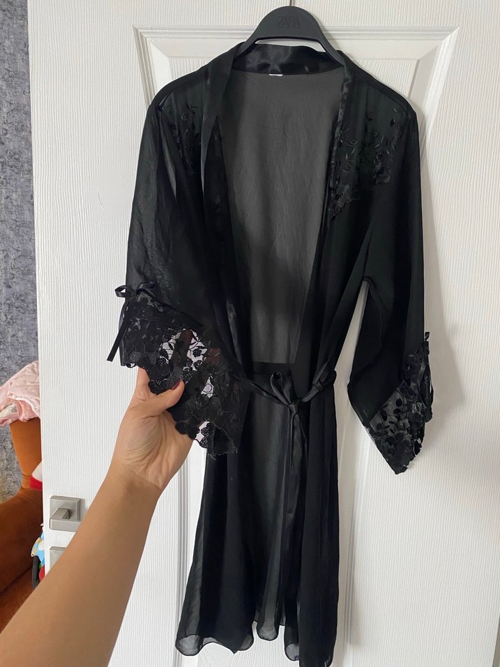 Uzun kollu, nakışlı ve dantel detaylı siyah, gevşek kesim gotik stil midi uzunlukta kadın sabahlık. Belde bağlama ipi bulunur.