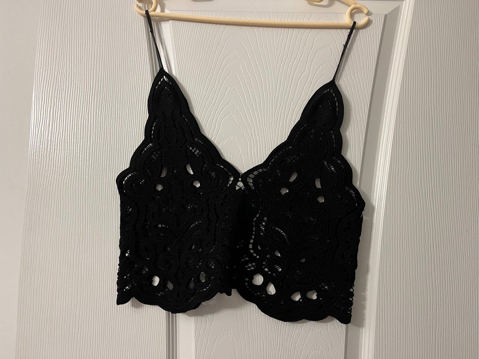 İnce askılı, kısa mini uzunlukta, detaylı nakışlı siyah gotik bralet. Koyu tarzı zarif detaylarla birleştirir. Not: askılarının derisinde soyulma mevcut haricinde herhangi bir problem yok