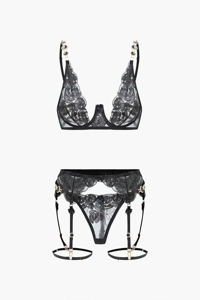 Nakışlı Siyah Gotik Mini Sütyen ve Jartiyer Takımı
