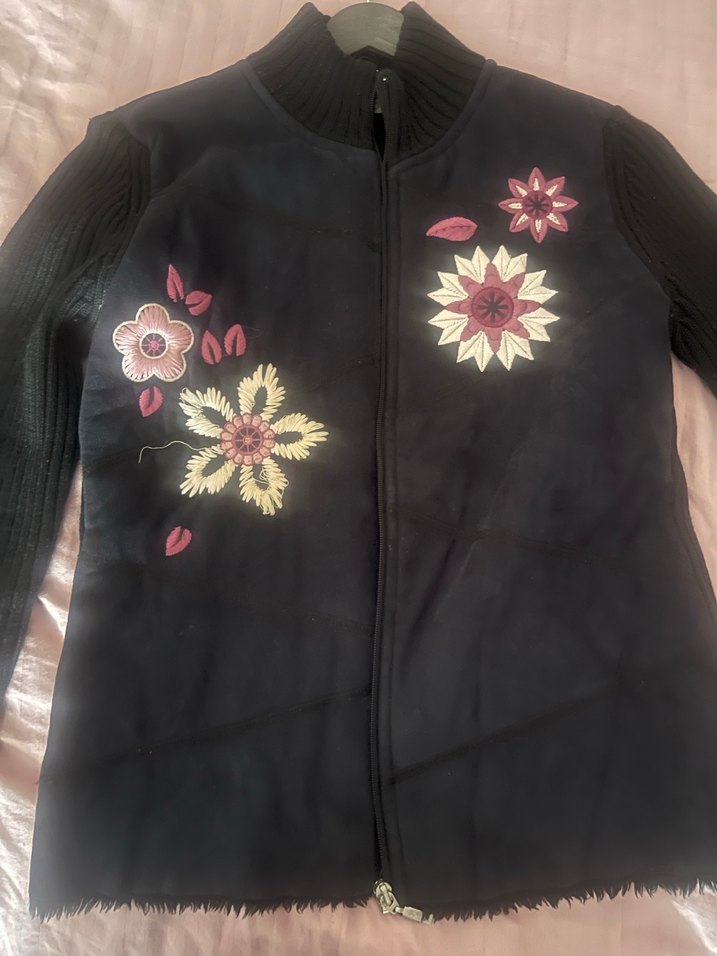 Nakışlı çiçek desenleri, fermuarlı siyah kadın hırka uzun kollu ve vücuda oturan kesime sahiptir.ön detay süet arka ve kollar triko beden m ve l uyumludur