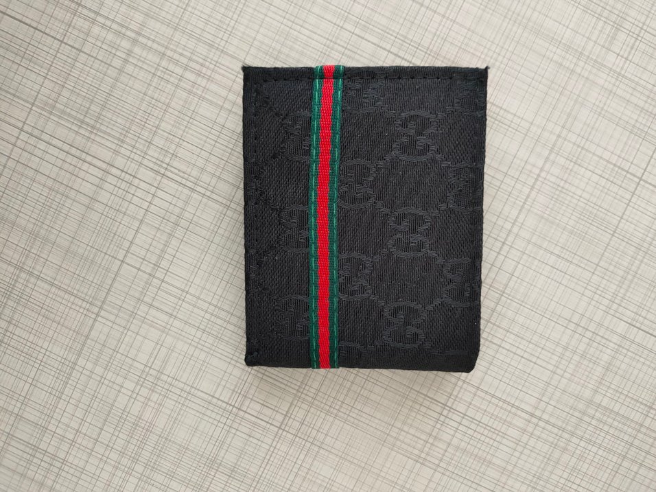 Nakışlı desenlere ve yeşil-kırmızı şerit detayına sahip siyah erkek cüzdanı, streetwear ve iş tarzını birleştirir.