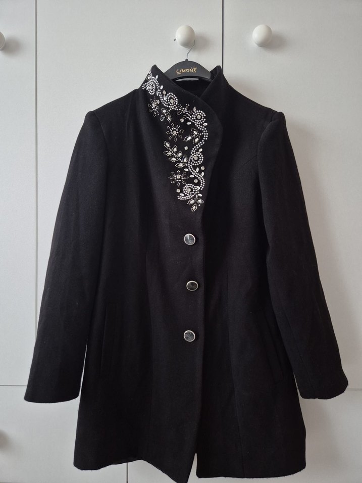 Yakası nakışlı, düğmeli, siyah kadın kaban. Yumuşak ve sıcak kumaştan üretilmiştir.