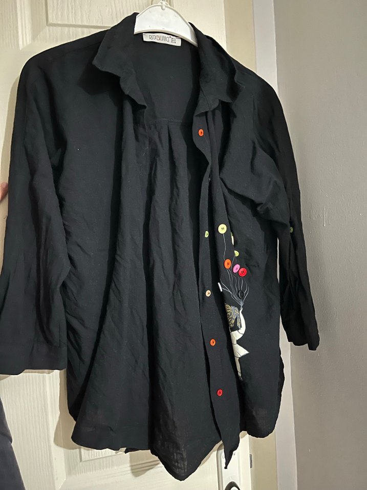 Siyah keten gömlek, uzun kollu ve yakası kesik. Nakışlı, düğmeli ve bol kesim, avant-garde tarzı için uygun.