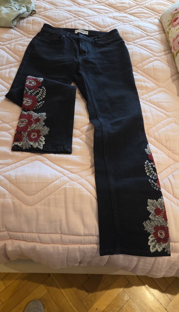 Nakışlı çiçek desenli, siyah kot pantolon. Bohem tarzda, hafif ispanyol paça