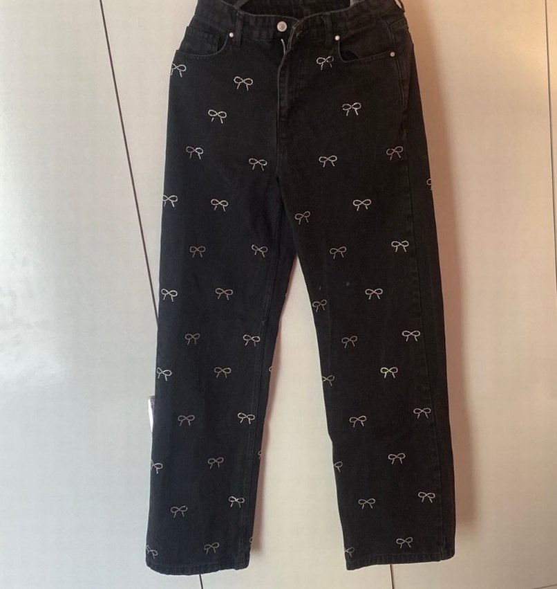 Nakışlı fiyonk desenleriyle siyah denim kot pantolon, salaş kesim ve midi boy ile rahat ve şık günlük kullanım için uygundur. Az kullanılmıștır.