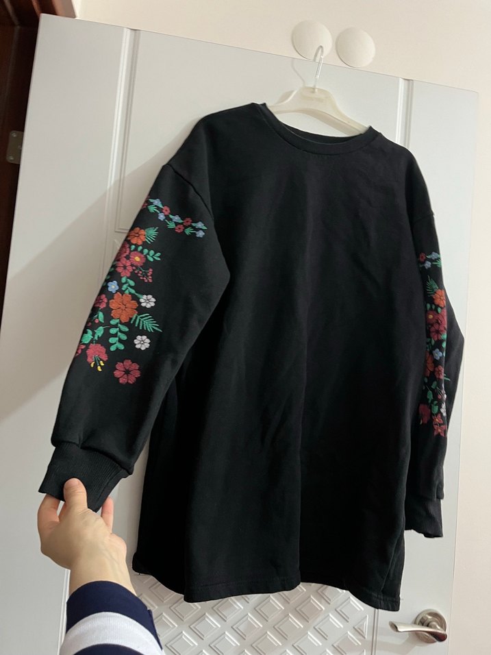 Bu siyah örme sweatshirt, uzun kollu ve renkli çiçek nakışlıdır. Yuvarlak yaka ve bol kesim ile rahat, bohem sokak stili sunar.