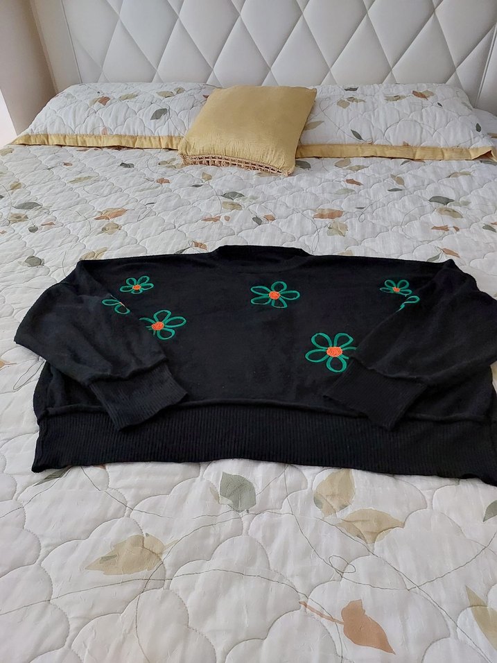 Uzun kollu, yuvarlak yakalı siyah triko kazak. Nakışlı çiçek desenleriyle bohem ve retro tarzda, günlük kullanıma uygun. M-l uygun salaş ürün