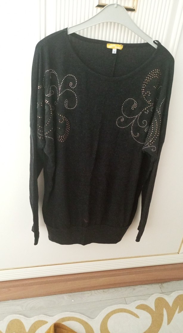 Uzun kollu, yuvarlak yakalı siyah triko kazak, önünde nakışlı desenler bulunur. Salaş kesim ve normal boyda, şık ve rahat bir tercih. önünde çok belli olmayan leke var