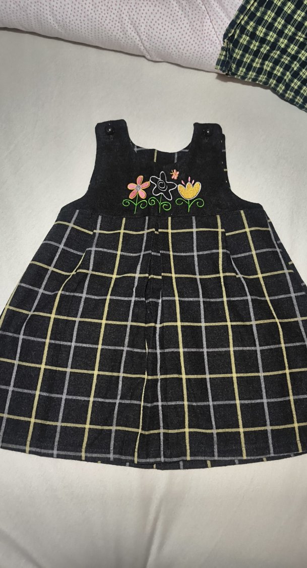 Nakışlı çiçek detaylı, siyah kolsuz kız elbisesi. Kareli etek kısmı ve düğmeli askıları ile bol kesim sunar.