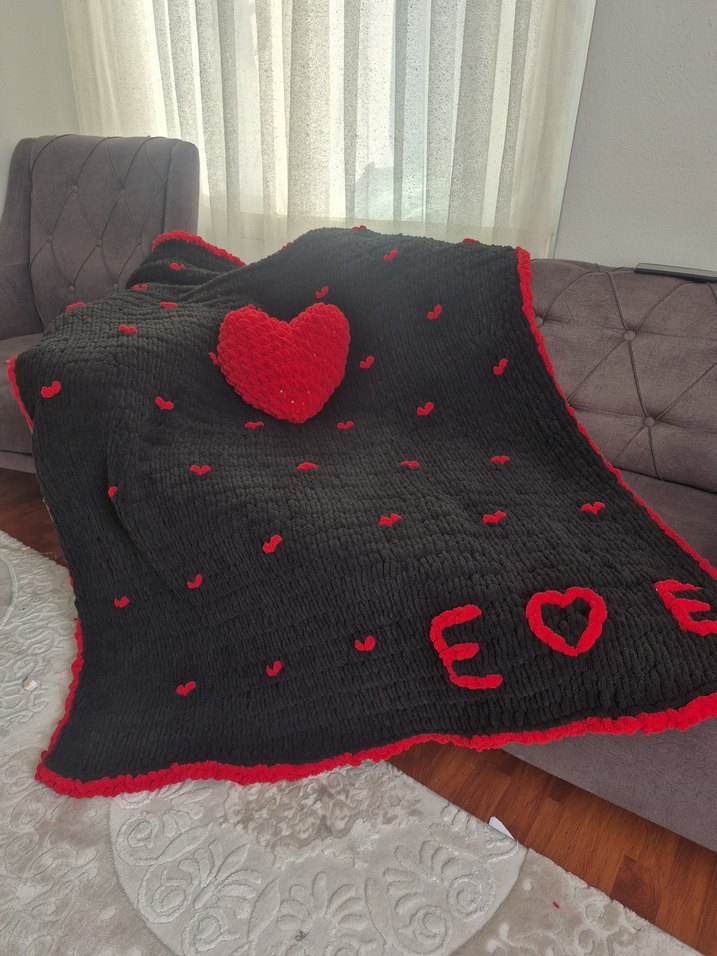 Koyu siyah renkteki bu battaniye, kırmızı nakışlı kalpler ve kalp şekilli "LOVE" yazısıyla sıcak ve dekoratif bir görünüm sunar. ❤️