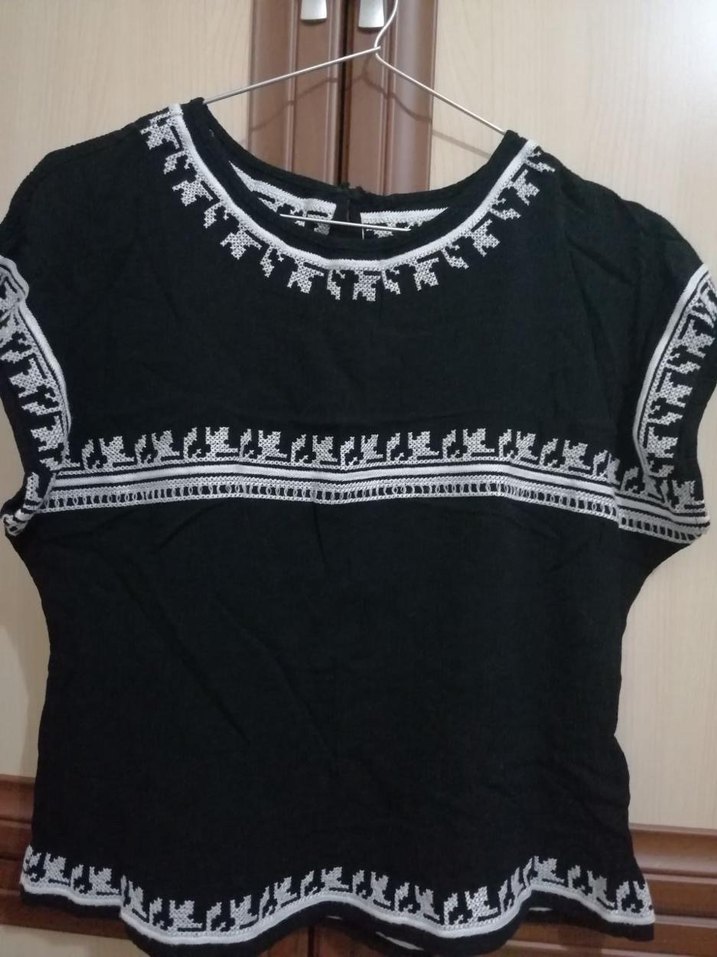 siyah örgü bluz, yuvarlak yaka ve kısa kolludur. Nakış detayları ve kesimiyle bohem tarzını yansıtır. Günlük kullanım için uygundur. Marka temsili. Tertemizdir. S ve M beden uyumlu.