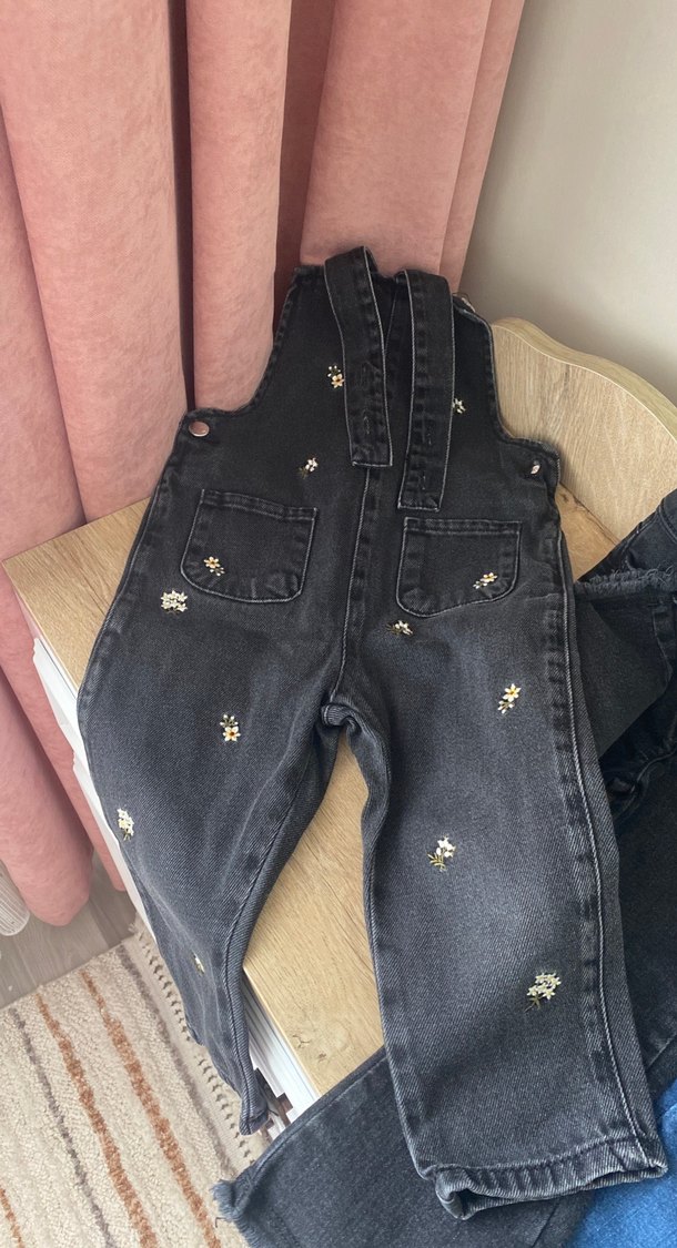 Siyah kot kumaştan, nakışlı çiçek detaylı, bol kesim kız tulum. Ayarlanabilir tokalı askıları vardır. 3 adet pantolonun fiyatıdır. Kızım büyüdüğü için kullanamadım pek yeni gibidir. 2-3 yaşa uygundur üçüde.