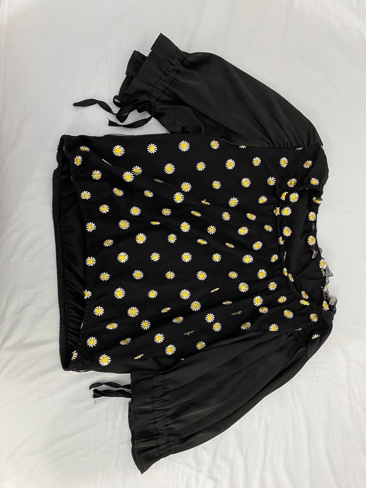 Düğmeli, kısa kollu, salaş kesim siyah bluz, nakışlı ,saten, papatya desenleri ve kayık yaka ile günlük kullanıma uygundur.