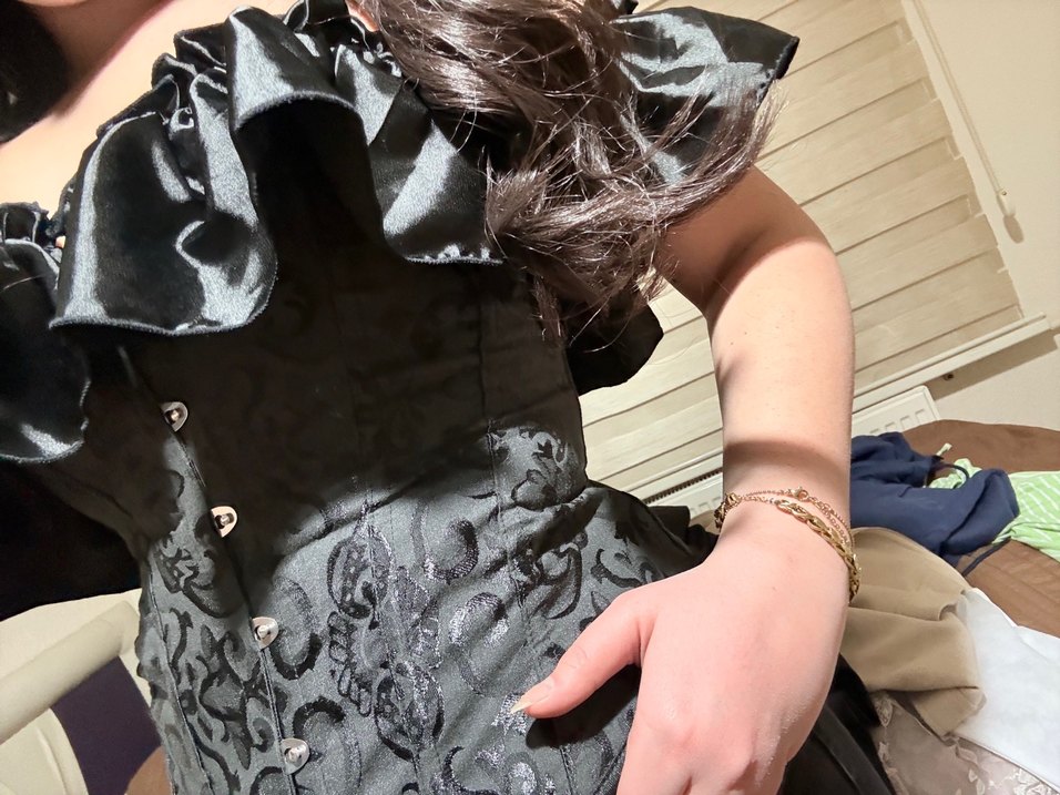 Parlak kumaş ve nakışlı desenli, orta uzunlukta, vücuda oturan siyah korse ürün daha önce dışarıda hiç giyilmedi pantolon veya etek ile çok şık duran bir korsedir.
