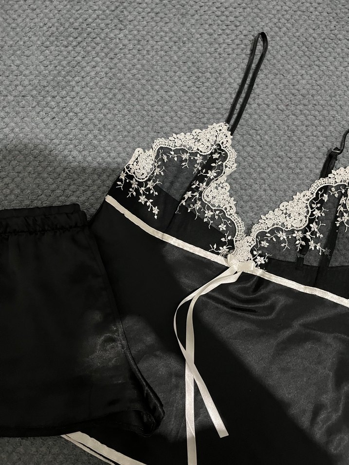 Nakışlı beyaz detaylı, askılı ve siyah mini pijama takımı, gotik ve Paris esintileri taşıyor.