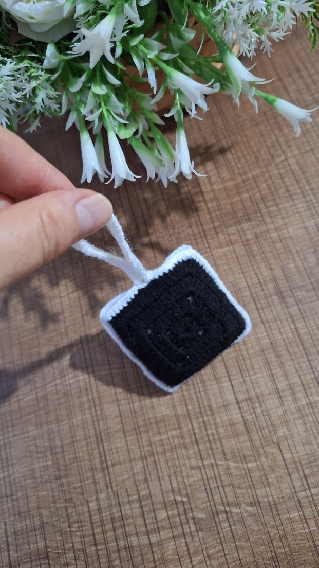 Nakışlı desenli siyah mini Bluetooth kulaklik cantaso , beyaz kenarlıklı ve asma halkalı.cantaya asili güvenle tutmak için uygun.