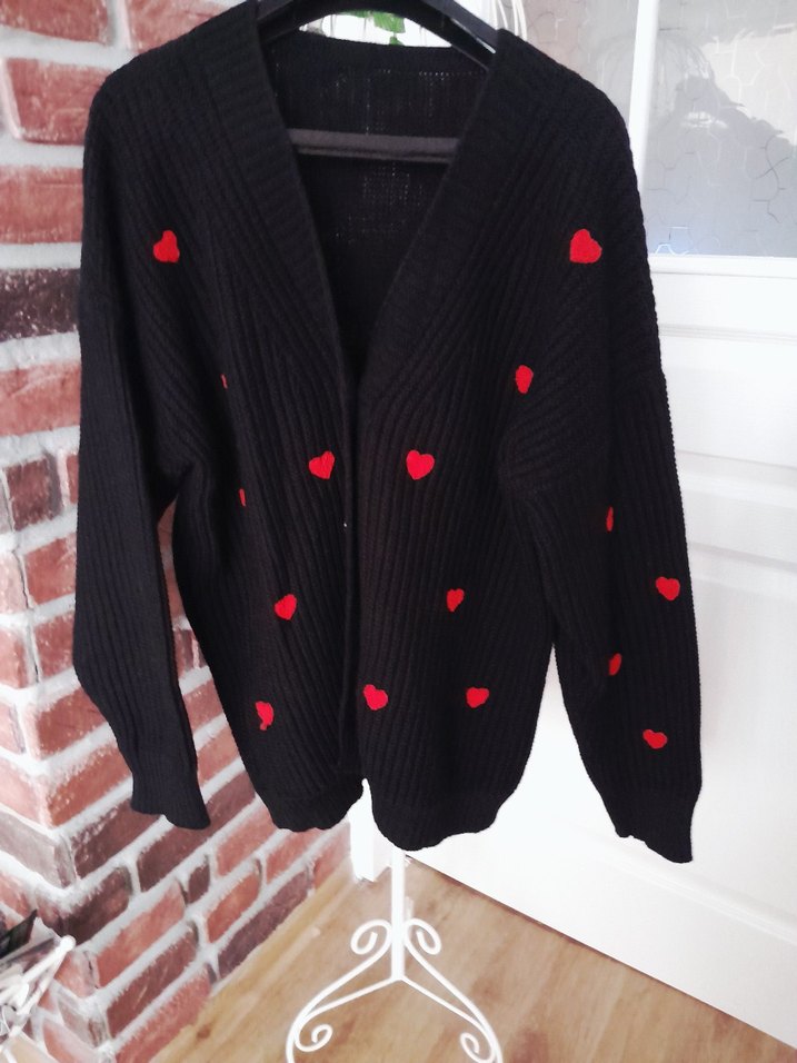 Uzun kollu, nakışlı kırmızı kalp desenli siyah örgü hırka ile bedeniniz sıcak kalsın Salaş kesimi ile rahatlığın keyfine varın