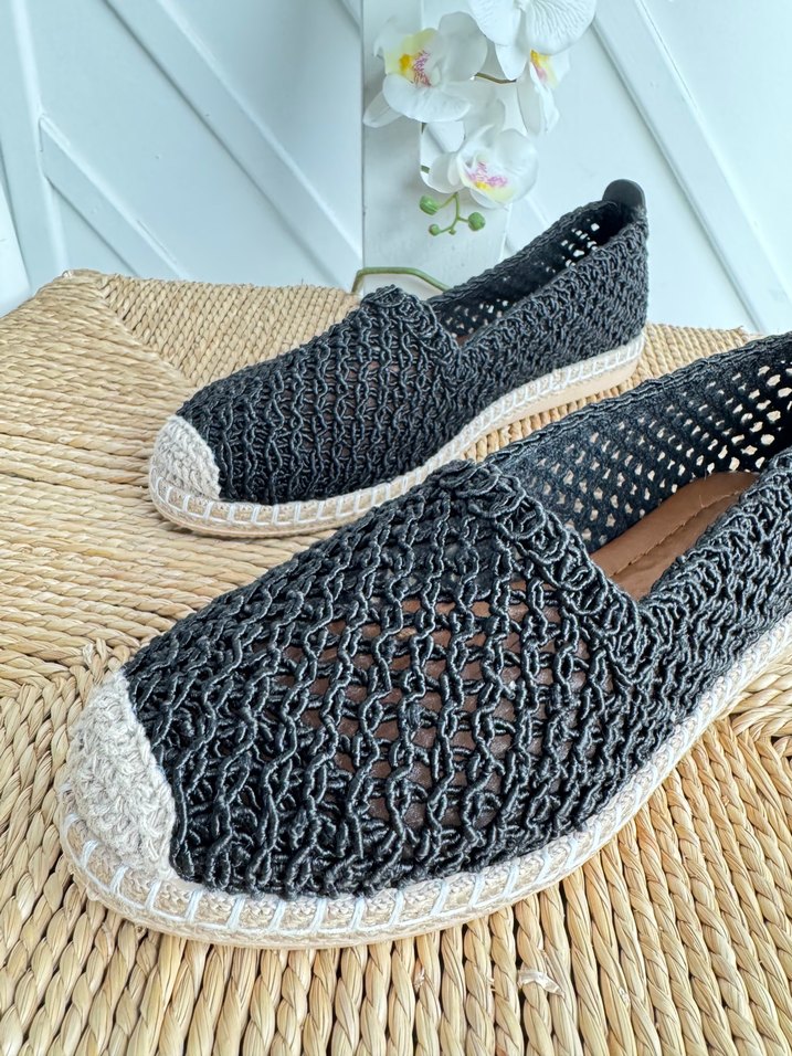 Nakış detaylı siyah örgü kadın espadril, dolgu topuklu ve nefes alabilir yapıda, günlük kullanım için uygun.
