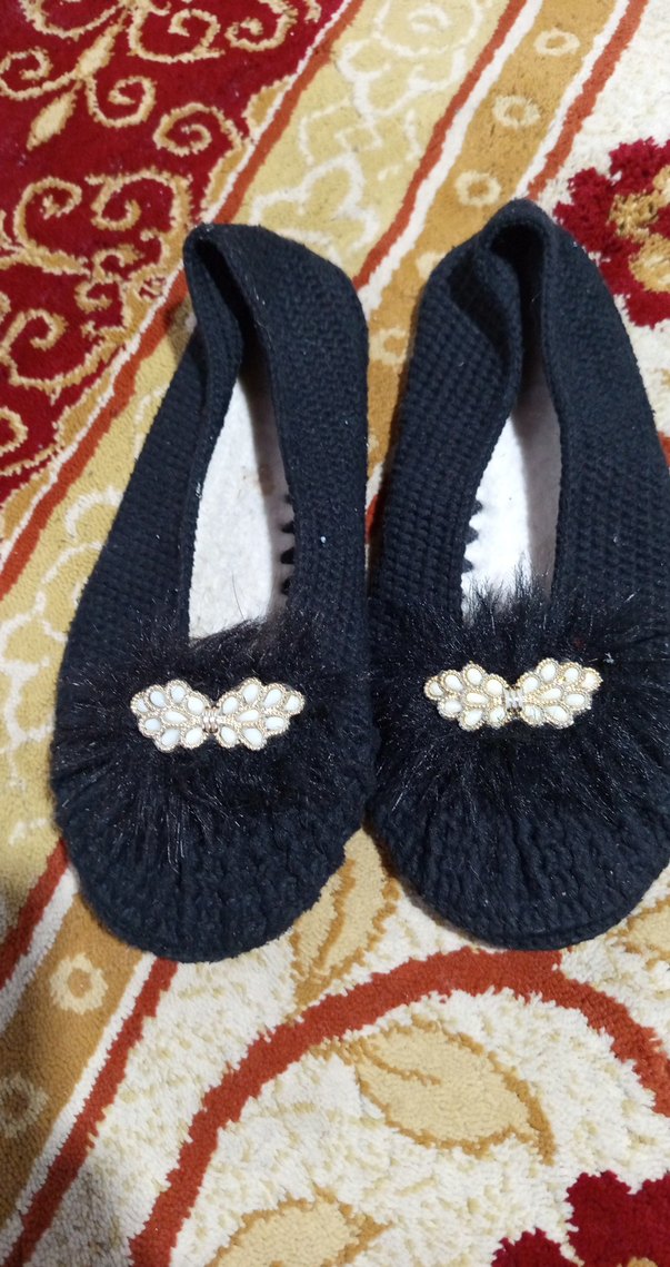 kullanılmış fotoğraflandigi gibidir.nakışlı ve örgü detaylı siyah kadın ev terlikleri, dolgu topuklu ve rahat kullanıma uygundur.