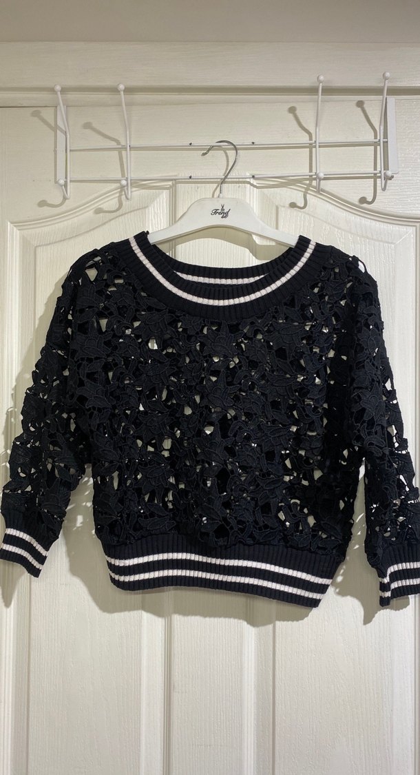 Nakışlı detaylara sahip siyah örgü kadın kazak, bol kesim ve uzun kolludur. Yuvarlak yaka ve kısa boyuyla günlük rahat kullanıma uygundur.