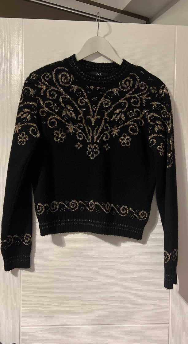 Uzun kollu, yuvarlak yaka, siyah örgü kazak, nakışlı detaylarla bohem tarzda rahat bir görünüm sunar.